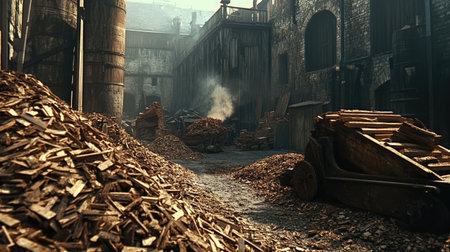 A gritty urban scene captures a narrow alleyway lined with wood piles and smoke, depicting a rich history of industry and craftsmanship in an old building.