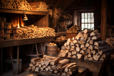 Rustic warehouse with wooden piles and bricks, generative AI