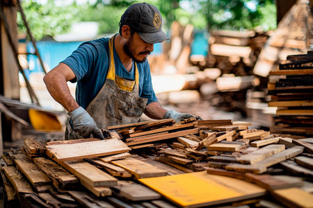 A worker diligently organizes various wooden planks in a bustling workshop. Sunlight filters through trees, illuminating his focused expression as he sorts the materials with care and precision.