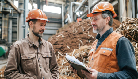 In a factory, two workers in hard hats are inspecting a clipboard. They seem to be engineers or construction workers