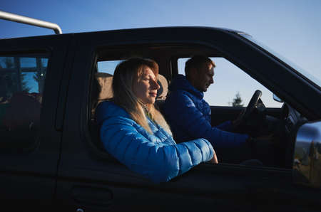 Man and woman in blue jackets sitting in car. Man trying to start engine of car, and woman looking wearily forward, leaning against the side door. Concept of travelling, car trip and relationships.