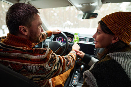 Caucasian man discussing plans for vacation with his wife while driving car on winter day