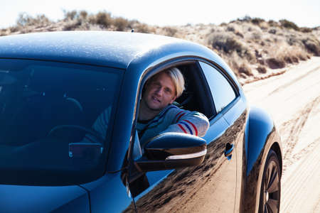 Image of a stylish man driving a car on a sunny day. Taxi concept. Mixed media