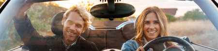 Smiling young man and girlfriend sitting in a car enjoying each other's company on a sunny day