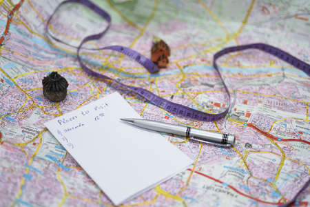 Flat lay of city map, travel guidebook, and old-fashioned travel journal