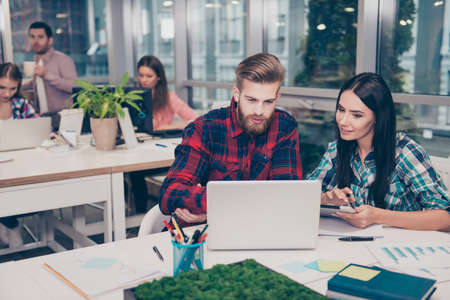 Portrait of two busy colleagues working with laptop on financial project on modern workplace openspace