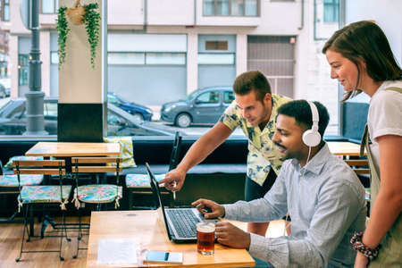 Group of young business people working together in a modern coffee shop.
