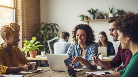 Group of a young business multiethnic people brainstorming and discussing business plan on meeting at sunny bright office interior.