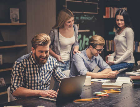Young smart people are using gadgets and smiling while working hard in the modern library