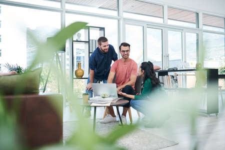 The headquarters of the hottest tech talent in town. a group of young businesspeople using a laptop together in a modern office.