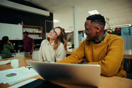 A businessman working on his laptop and woman smiling and talking next to him