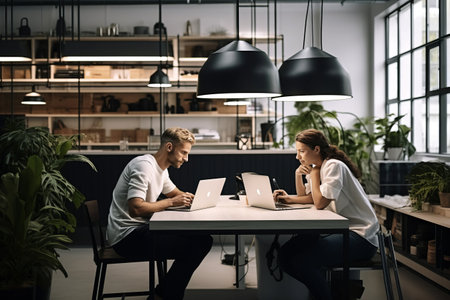 Couple of freelancers working together in modern coworking space. Distance work concept