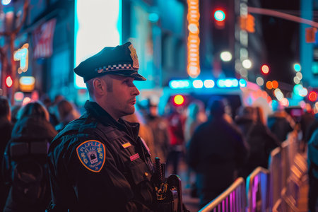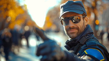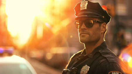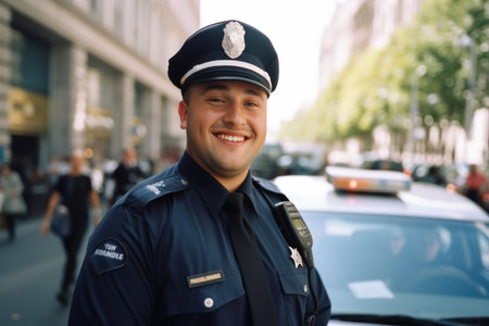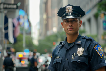 Police Officer: A police officer in uniform stands watchful on a city street, ensuring public safety.Generated with AI