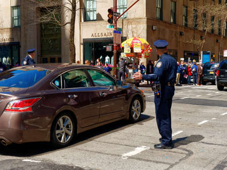 New York City, USA - Apr 2018: Officer directing traffic in Manhattan