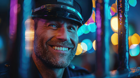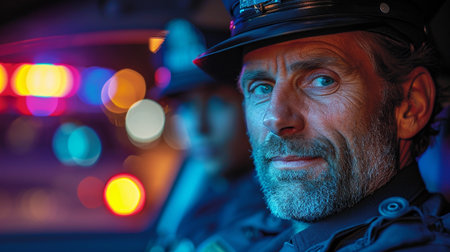 Focused male policeman monitoring the streets at night, embodying authority and safety in a city setting. A.I.