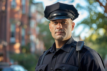 Close up image of a police officer in uniform, symbolizing law enforcement, security, and public service.