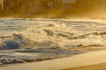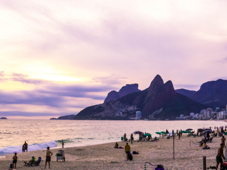 Rio de Janeiro, Brazil - January 2, 2020: A golden sunset from Sao Conrado Beach. Pedra da Gavea, a tall granite rock mountain sits at the end of the urban beach, and people relax in the white sand.