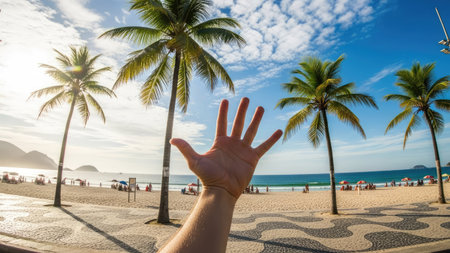 Hand of a man on the beach with palm trees and blue sky