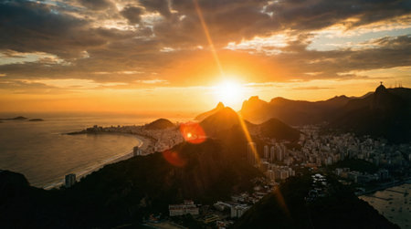 A breathtaking aerial view of a vibrant sunset over a coastal city, with sun rays bursting over silhouetted mountains and a golden glow on the ocean.
