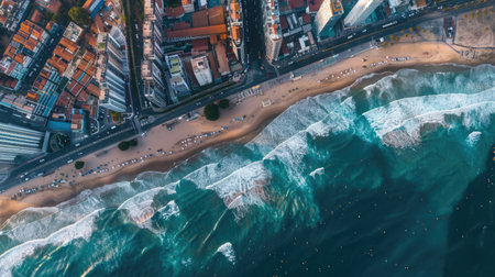 Many people are at the beach enjoying the sun and swimming in the ocean while waves crash against the shore. The scene shows a lively coastal area with sand and water.