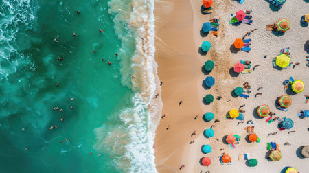 Sea beach with colorful umbrellas and relaxing people, aerial top view. Crowded sandy beach at high season. Tourists at summer holidays. Created with Generative AI