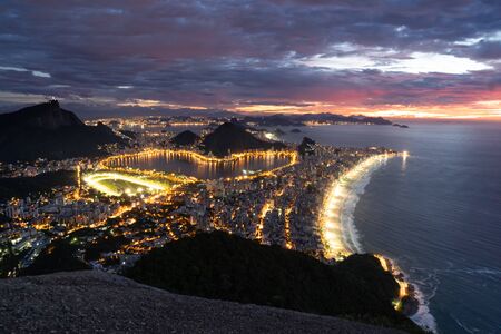 Sunrise from the top of the Morro Dois Irmaos (Two Brothers Hill) hiking trail in Rio de Janeiro, Brazil, looking over the city lights of Ipanema Beach, Lagoa, Sugarloaf Mountain and the Jesus statue.