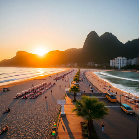 Sunset view of Copacabana beach and Avenida Atlantica in Rio de Janeiro, Brazil