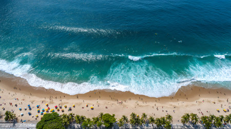 Overhead view of Copacabana beach showing people, waves, and palm trees