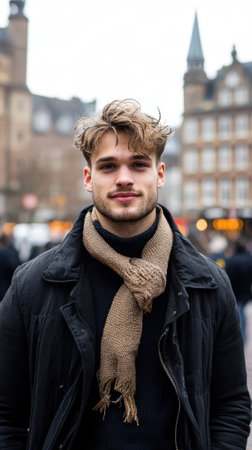 A man with a scarf around his neck and a black coat. He is smiling and looking at the camera