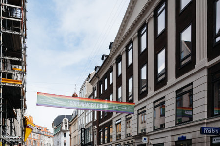Copenhagen, Denmark - August 10, 2016. Gay pride parade rainbow flag in street in historical city centre of Copenhagen
