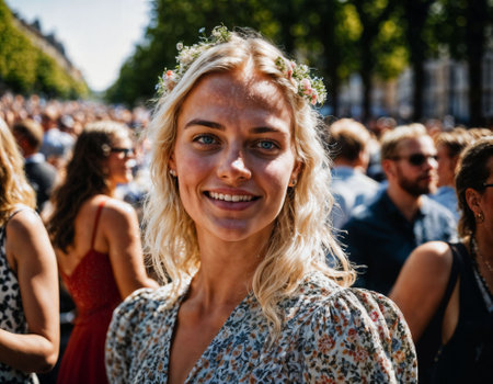 photo of beautiful woman at parade street in Europe country, generative AI