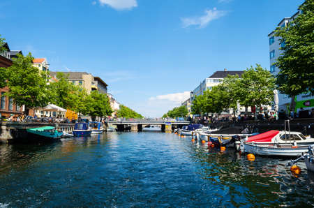 Waterfront view of a canal in Copenhagen, Denmark on a Summer day