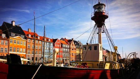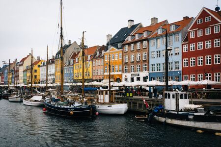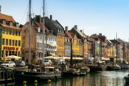 COPENHAGEN, DENMARK - JUNE 18 2018: View of Nyhavn waterfront with colorful buildings and boats in the canal on June 18,2018 in Copenhagen, Denmark