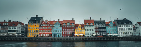 Capture the dramatic essence of Copenhagen’s skyline with this panoramic image, featuring the city’s blend of historic charm and contemporary design under an overcast sky