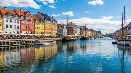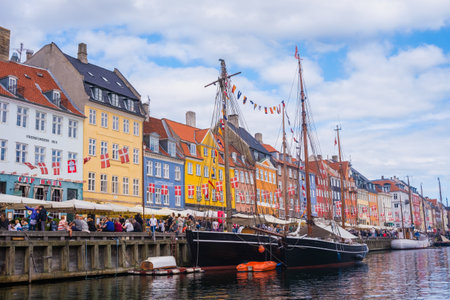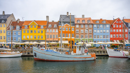 Copenhagen, Denmark - August 8, 2023: The most famous canal in Copenhagen with its quaint colorful houses overlooking the docked sailboats.