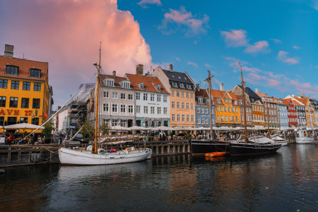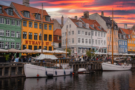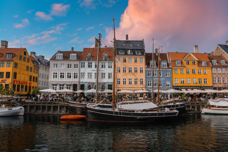 Copenhagen, Denmark - August 23, 2019: Famous Nyhavn pier with colorful buildings with people enjoying the terraces at sunset in Copenhagen, Denmark