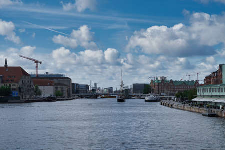 Copenhagen, Europe, harbor skyline with ships and buildings, blue cloudy sky