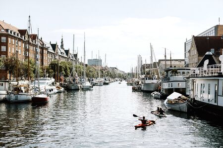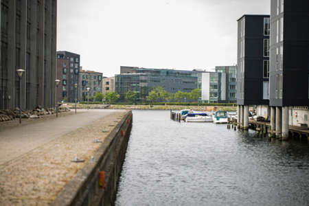 Copenhagen, the capital of Denmark. The picture is taken in the northeast part of the city. This is the Channel between the Amager island to the left, and the city center to the right. Wide angle.