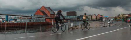 Panoramic crop of people cycling on urban street near canal with cloudy sky at background in Copenhagen, Denmark