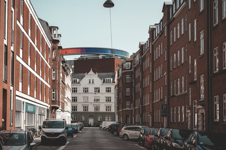 Aros Art Museum In Aarhus, View From The Distance With city street and residential buildings in front