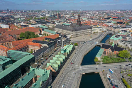 Copenhagen, Denmark - May 07, 2020: Aerial drone view of Christiansborg Palace and the former stock exchange building