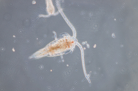 Copepods are a group of small crustaceans found in the sea and nearly every freshwater habitat, are under microscope view.