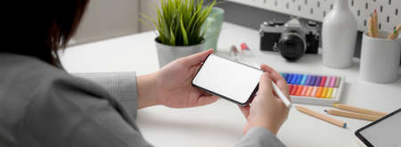 Cropped shot of professional designer using horizontal mock-up smartphone while sitting at minimal workspace with designer supplies