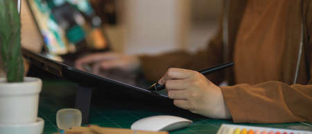 Close up view of female graphic designer working on drawing tablet with stylus pen on office desk