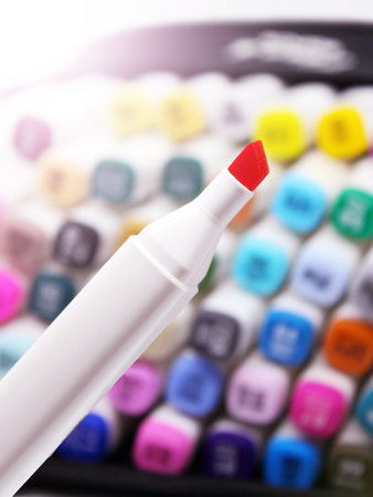 Close-up of markers on a white background. Selective focus.