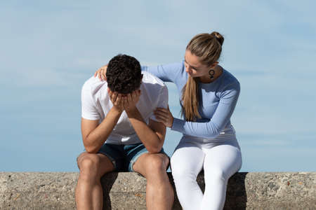 Tears. Crying young girl with colored hair, next to a man putting a hand on her shoulder soothing talking.