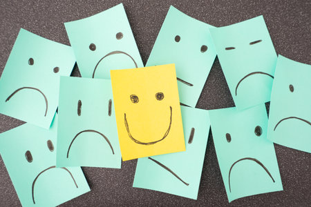 positive attitude or optimism concept - happy smiley face on yellow sticky note surrounded by sad unhappy blue faces
