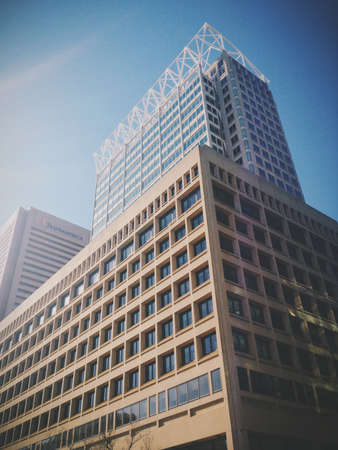 tall new steel and glass and old brick and glass office buildings with faded blue sky