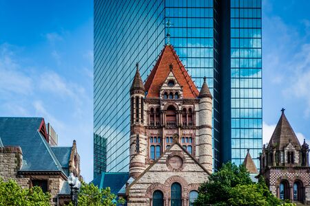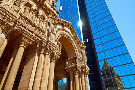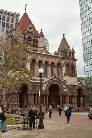 Boston, Massachusetts, USA. October 20, 2018. Romanesque Trinity Church in historic downtown Boston, surrounded by modern skyscrapers
