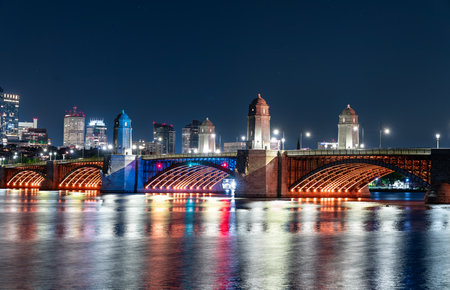 Night view of the Longfellow Bridge in Boston glowing with orange lighting, arching over the Charles River with reflections shimmering on the water and the city skyline in the background